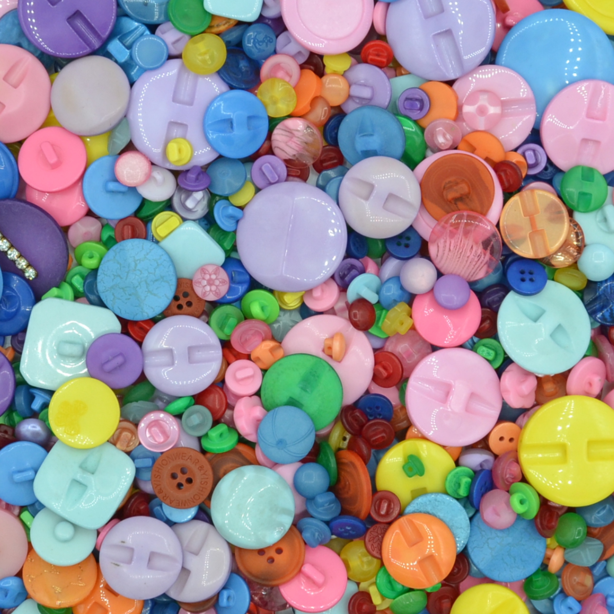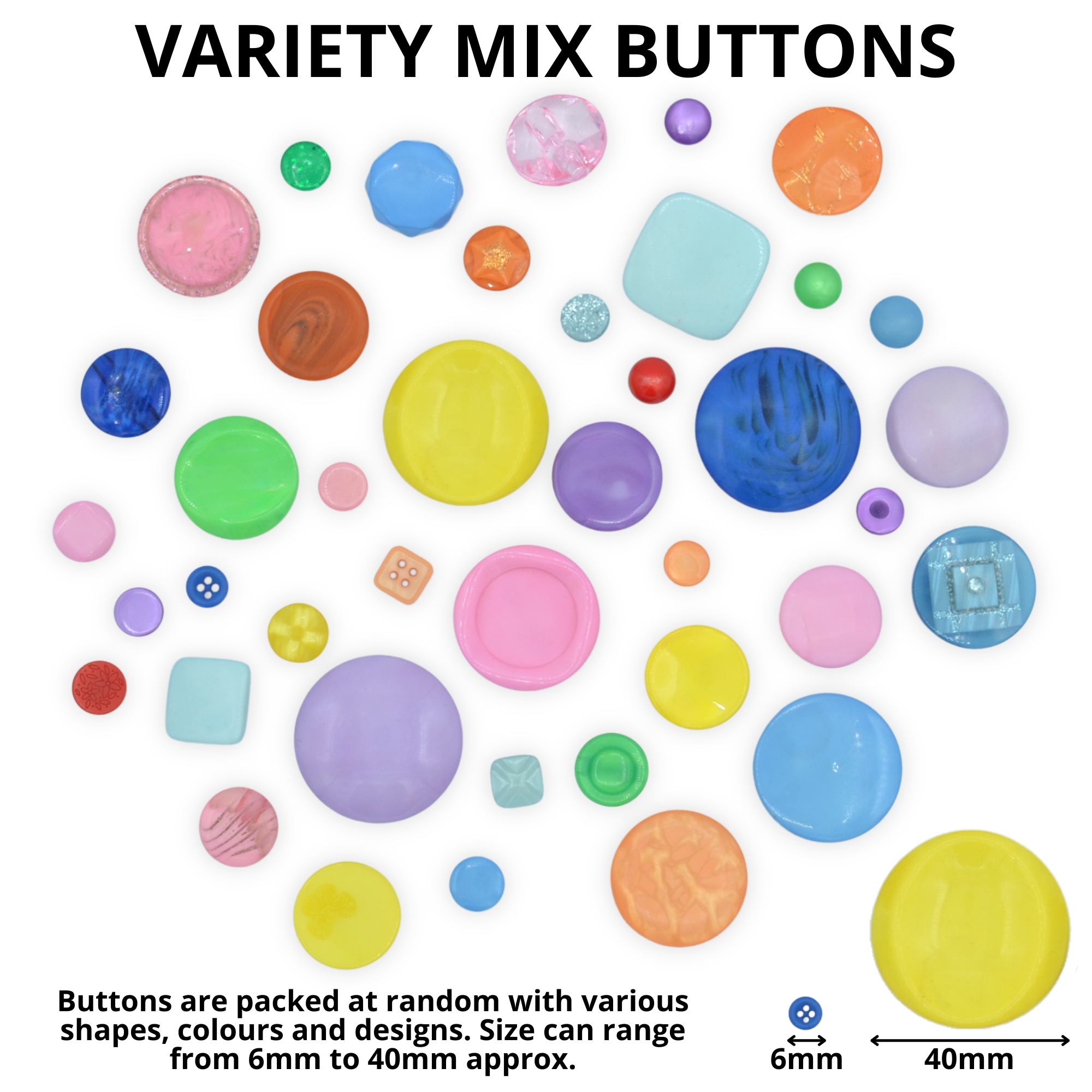 High Standard Polyester Buttons in Variety Mix. Buttons are packed at random with various shapes, colours and designs.