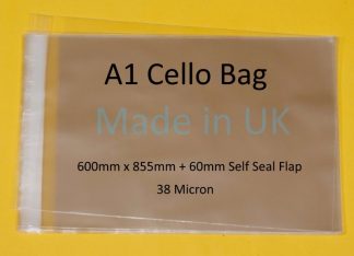 Pack of 100 – A1 Cello – 600mm x 855mm + 60mm Self Seal Flap – Cellophane Artist Size Display Bags 38 Micron – Large Cello