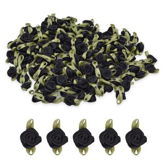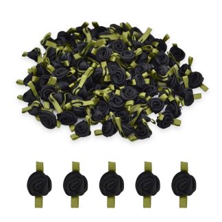 Black #02 with Green Leaves 15mm Satin Ribbon Roses