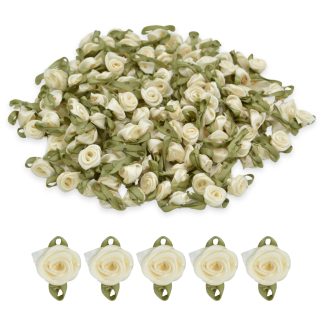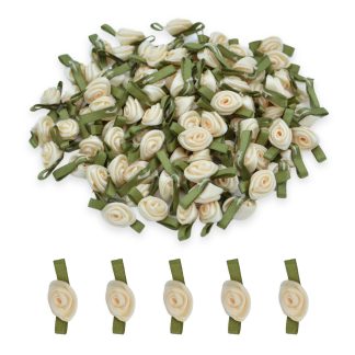 Cream #09 with Green Leaves 15mm Satin Ribbon Roses