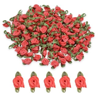 Coral #19 with Green Leaves 15mm Satin Ribbon Roses