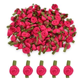Cerise #175 with Green Leaves 12mm Satin Ribbon Roses