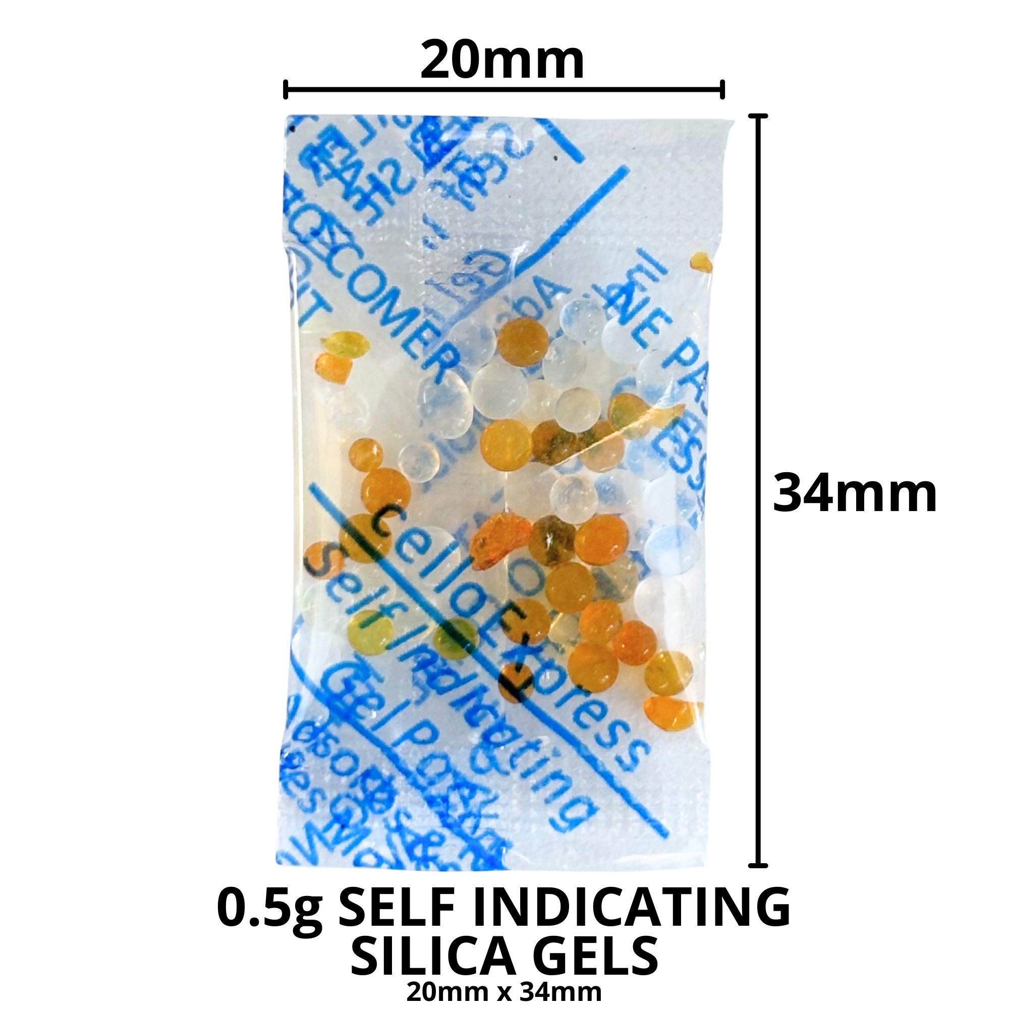 Celloexpress self indicating silica gel sachets offer reliable moisture protection with a built-in visual indicator. The silica gel changes colour from orange to green as they absorb moisture, making it easy to monitor humidity levels and identify when the sachet has reached capacity. The beads are sealed in clear plastic packaging featuring microscopic holes allowing moisture vapour to pass through while keeping beads securely contained.