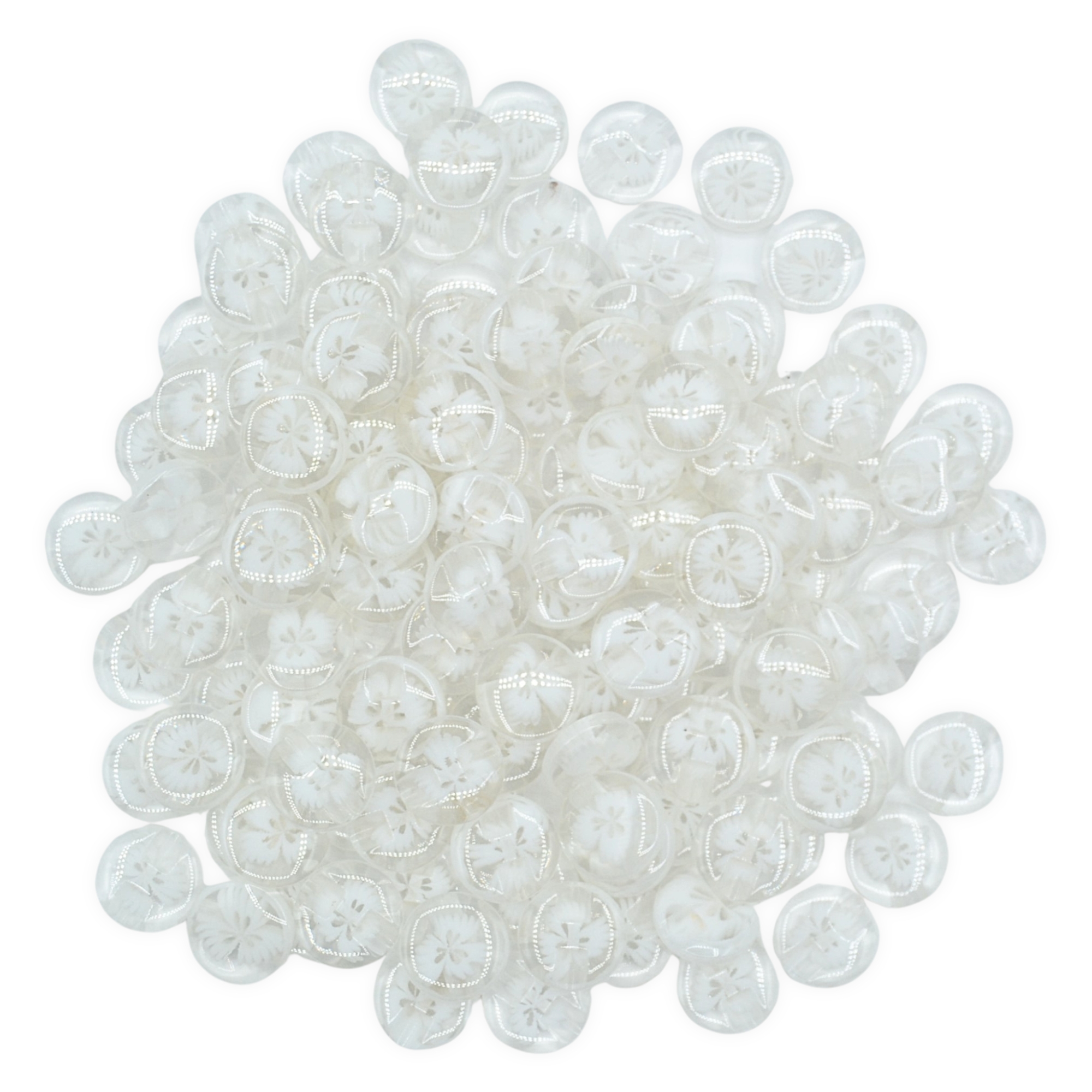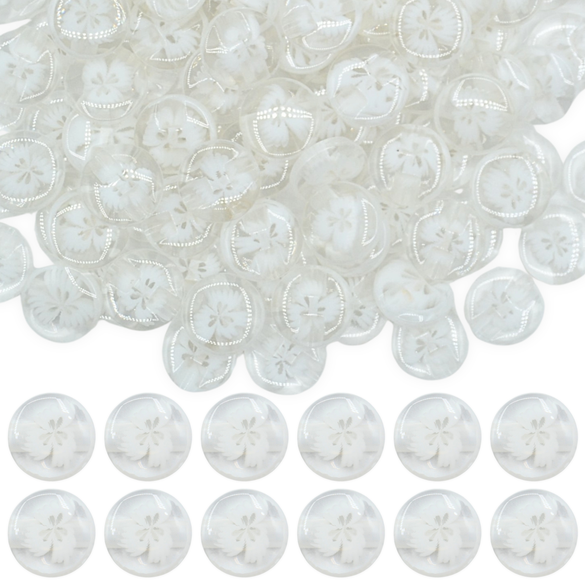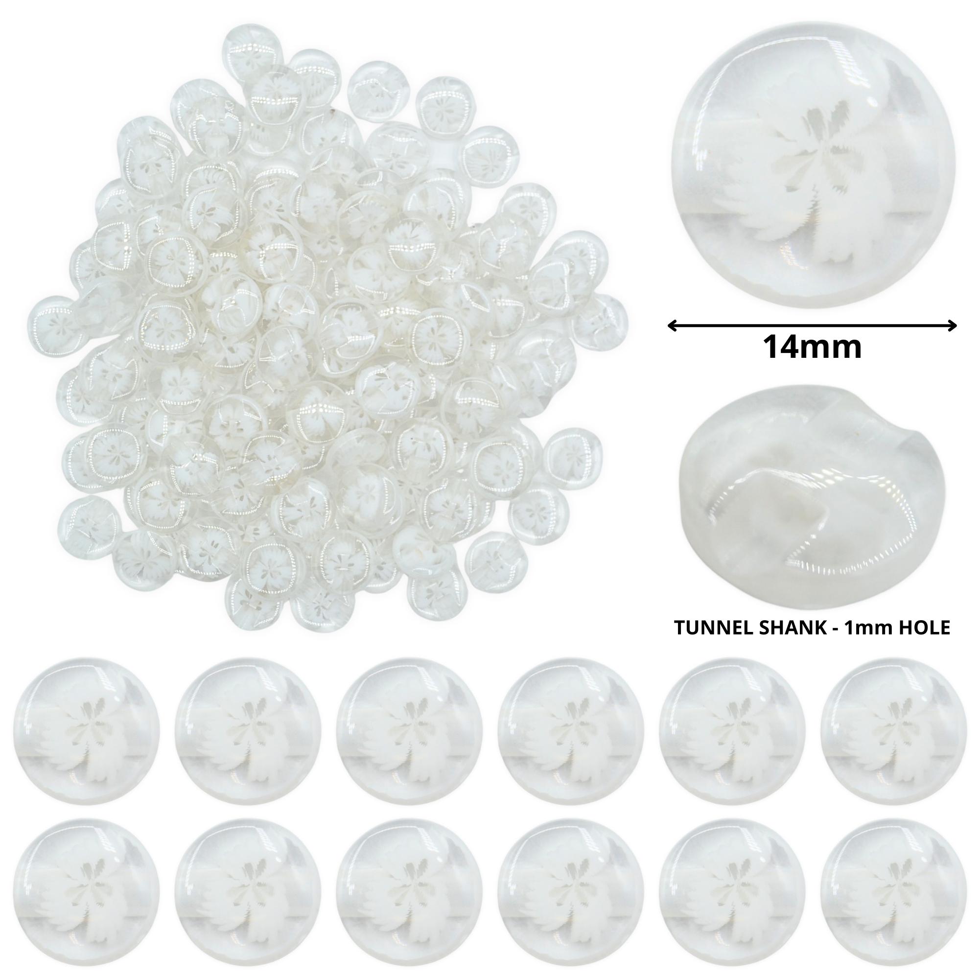 Made from moulded resin with a smooth glossy surface giving a glass-like look while remaining durable and lightweight yet sturdy, with embedded floral detail sealed inside. Featuring a tunnel shank design with 1mm hole to keep all stitching hidden underneath, leaving the front of the button clear to showcase the beautiful floral design. Since the stitching doesn’t rub directly against the button’s edge, shank buttons often last longer and are less likely to come loose.