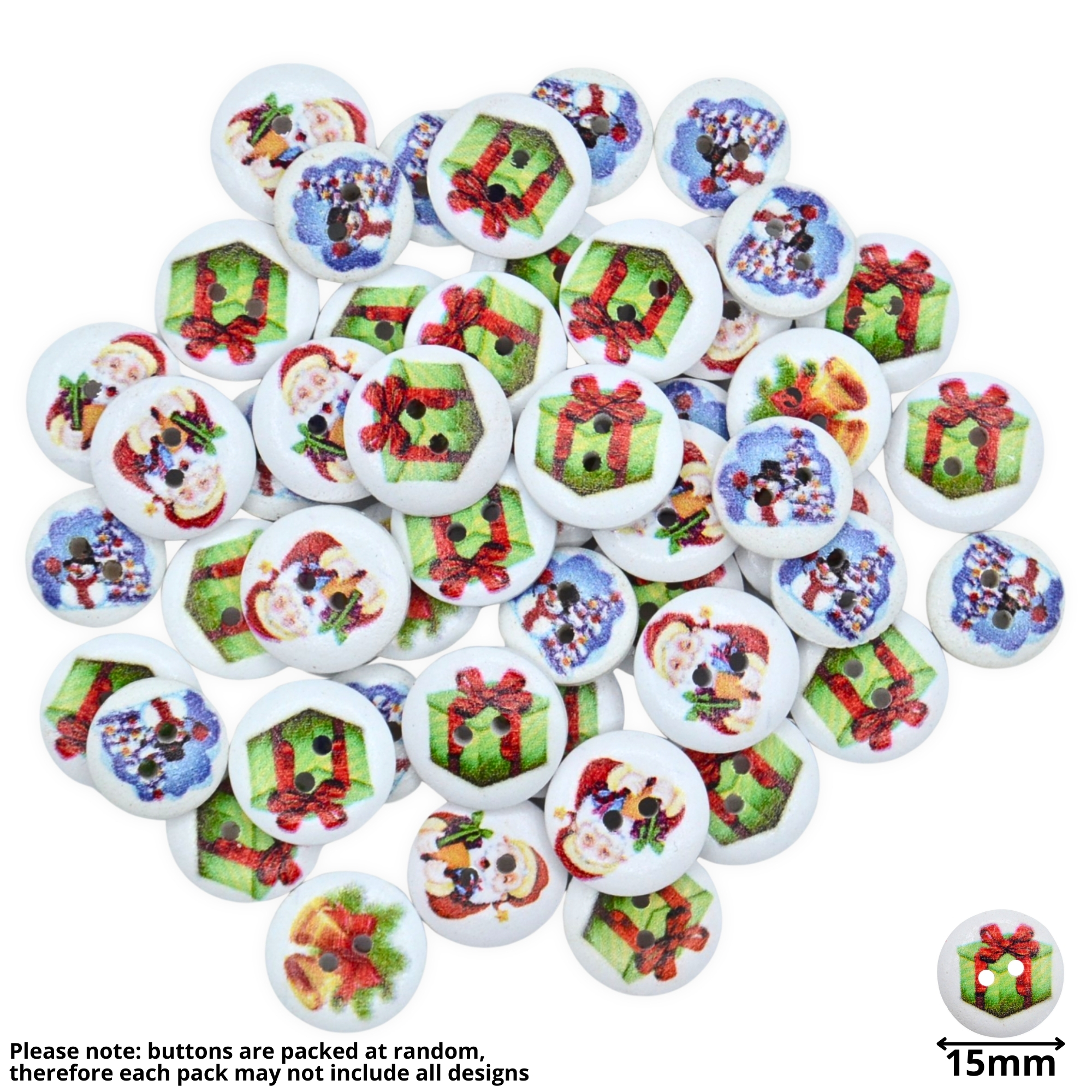 15mm Christmas 21 Christmas Mix – Printed Wooden Round Buttons