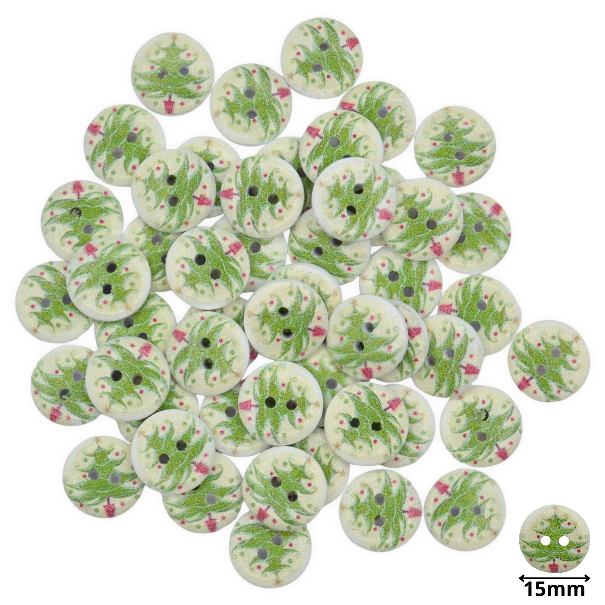 15mm Christmas 36 Christmas Tree – Printed Wooden Round Buttons