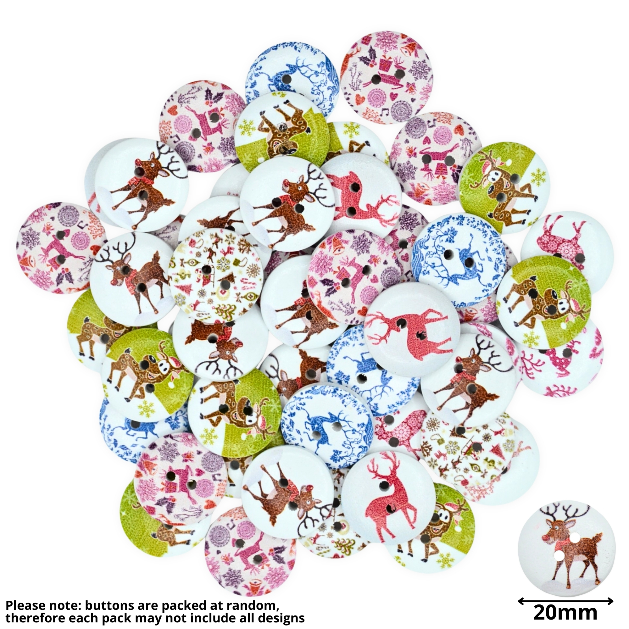 20mm Christmas 20 Reindeer Mix – Printed Wooden Round Buttons