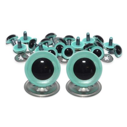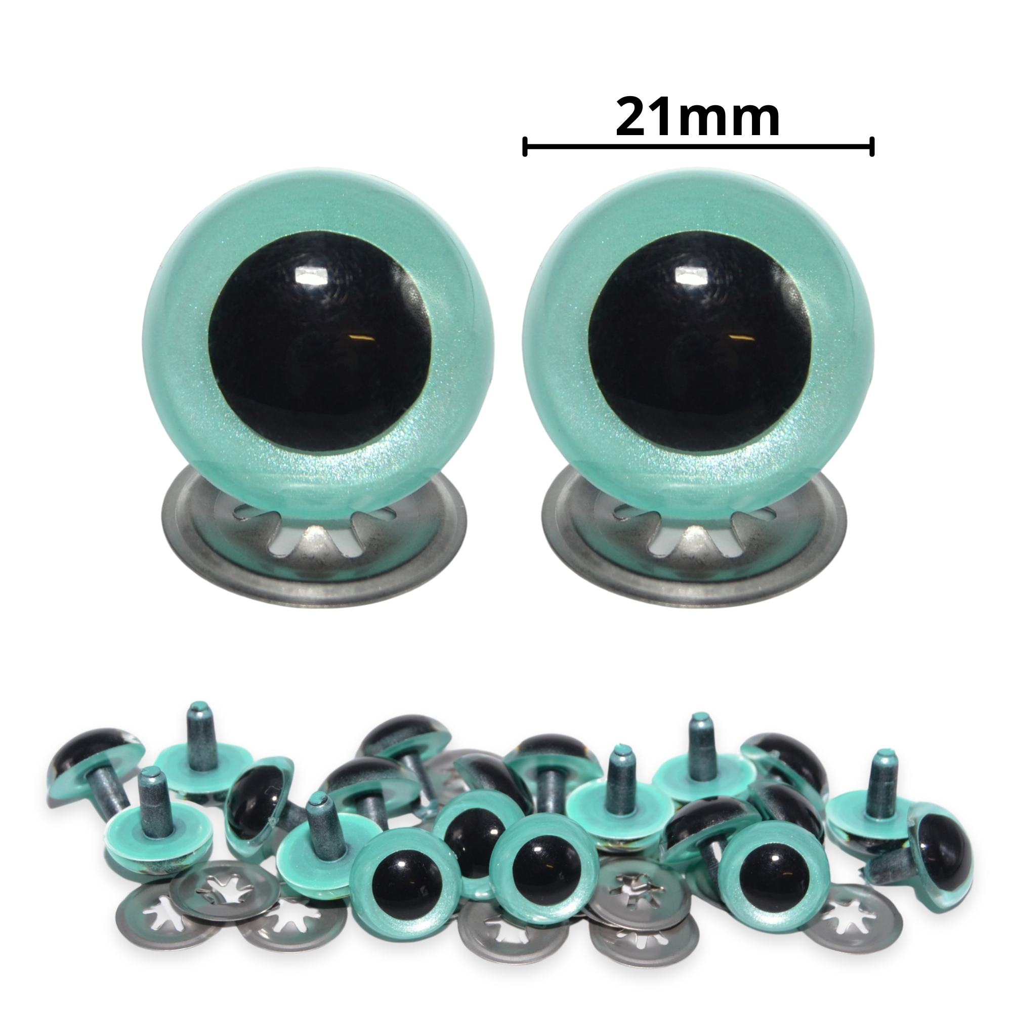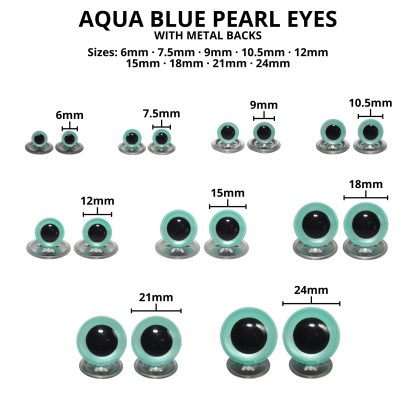 21mm Aqua Blue Pearl Crystal Eyes with Metal Backs. Useful for toy making or replacements for lost parts on your existing soft toys. Comes complete with safety clips to hold them securely in place. Conforms to safety standard EN71.