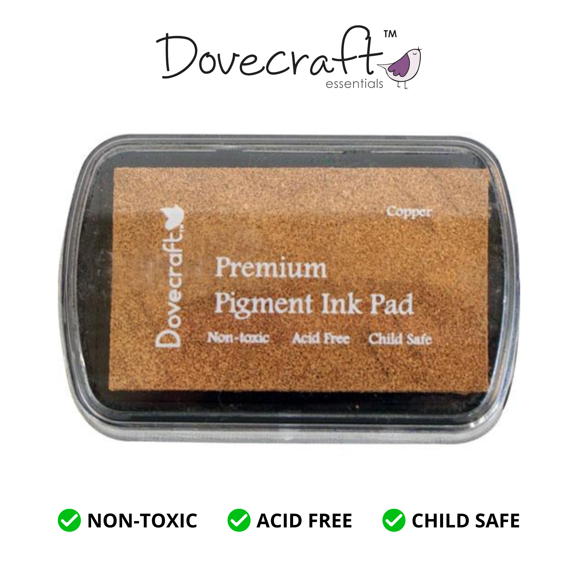 Dovecraft Premium Pigment Ink Pads in Copper. Fast drying premium solid colour ink pads, suitable for use on any type of paper and card. Can be used with embossing powders and heat tools.