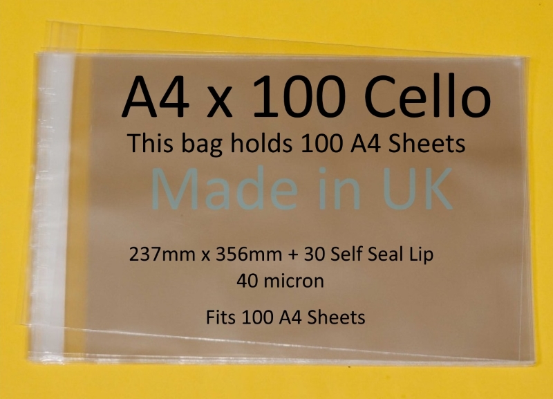 Pack of 100 – A4x100 Cello – 237mm x 356mm + 30mm Self Seal Flap – Cellophane Artist Size Display Bags 40 Micron – Large Cello