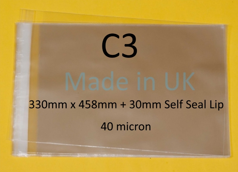 Pack of 100 – C3 – 330mm x 458mm + 30mm Self Seal Flap – Cellophane Display Bags 40 Micron – Large Cello