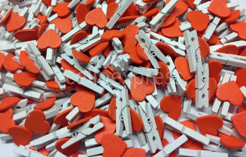 Pack of 250 – 30mm Orange Love Heart Mini White Wooden Pegs
