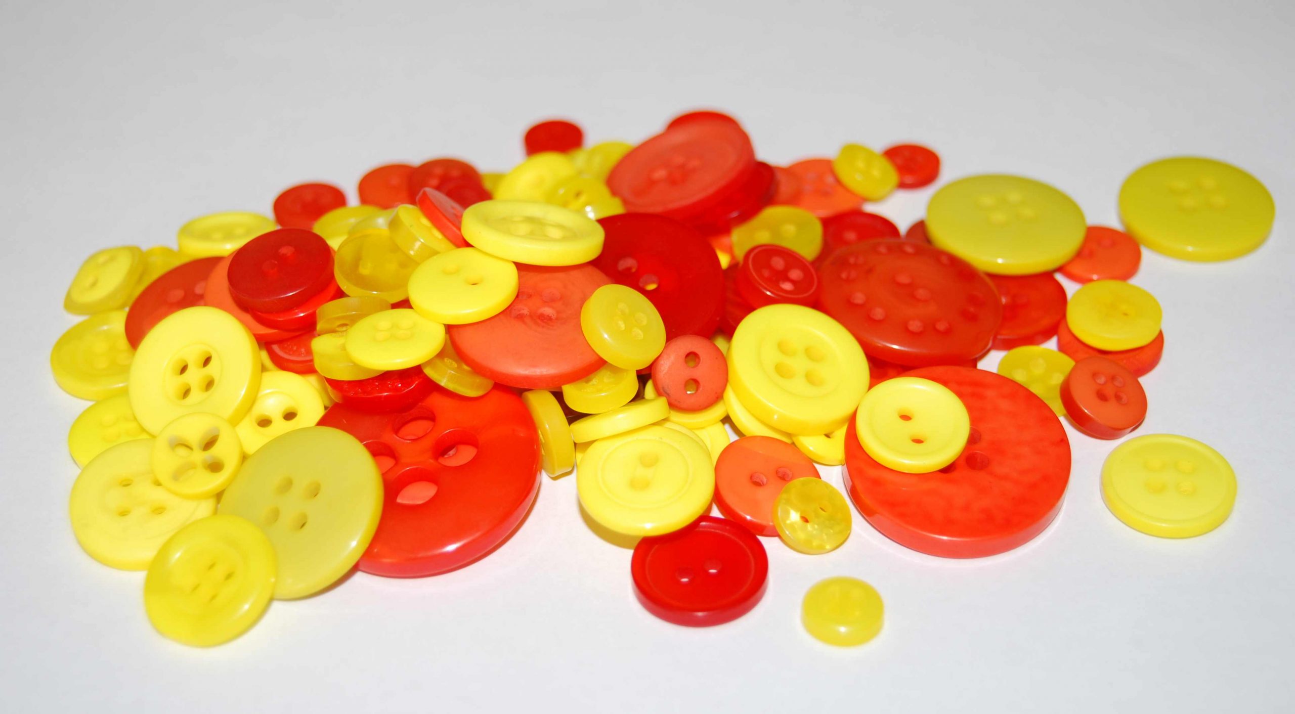 Pack of 50g – YELLOW & ORANGE Buttons – Mixed Sizes 11mm to 25mm