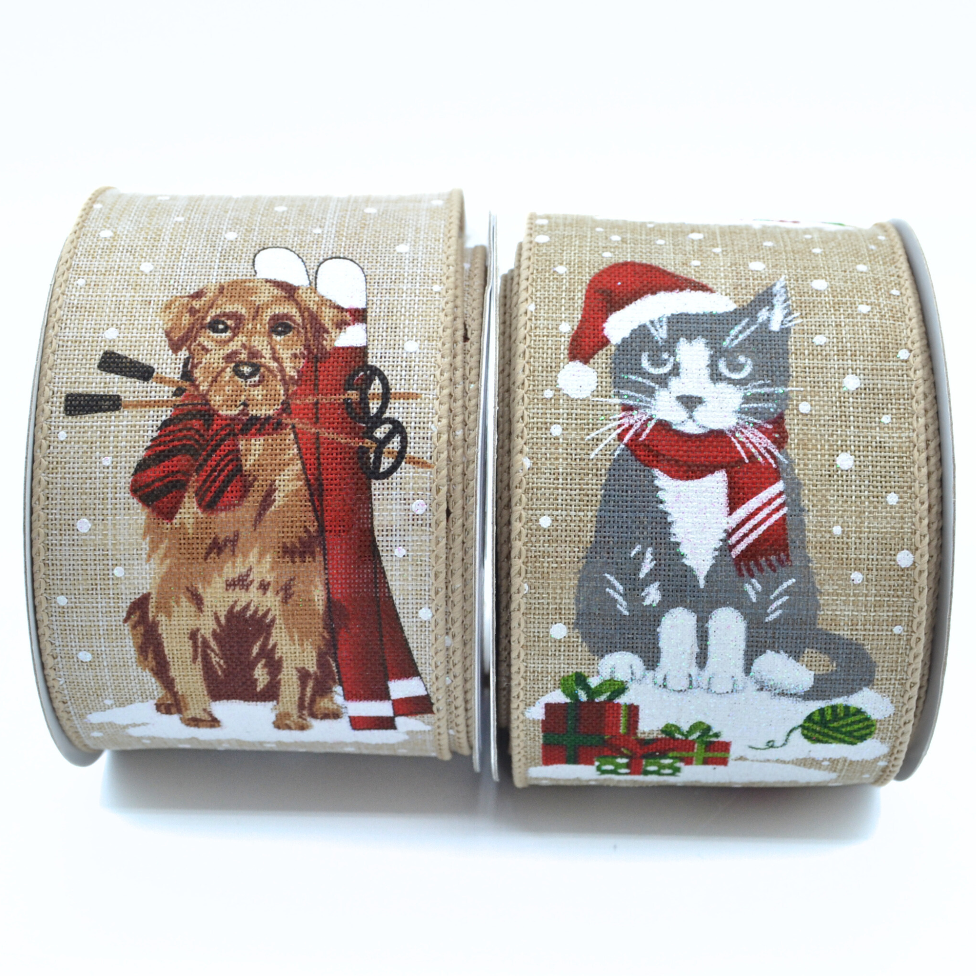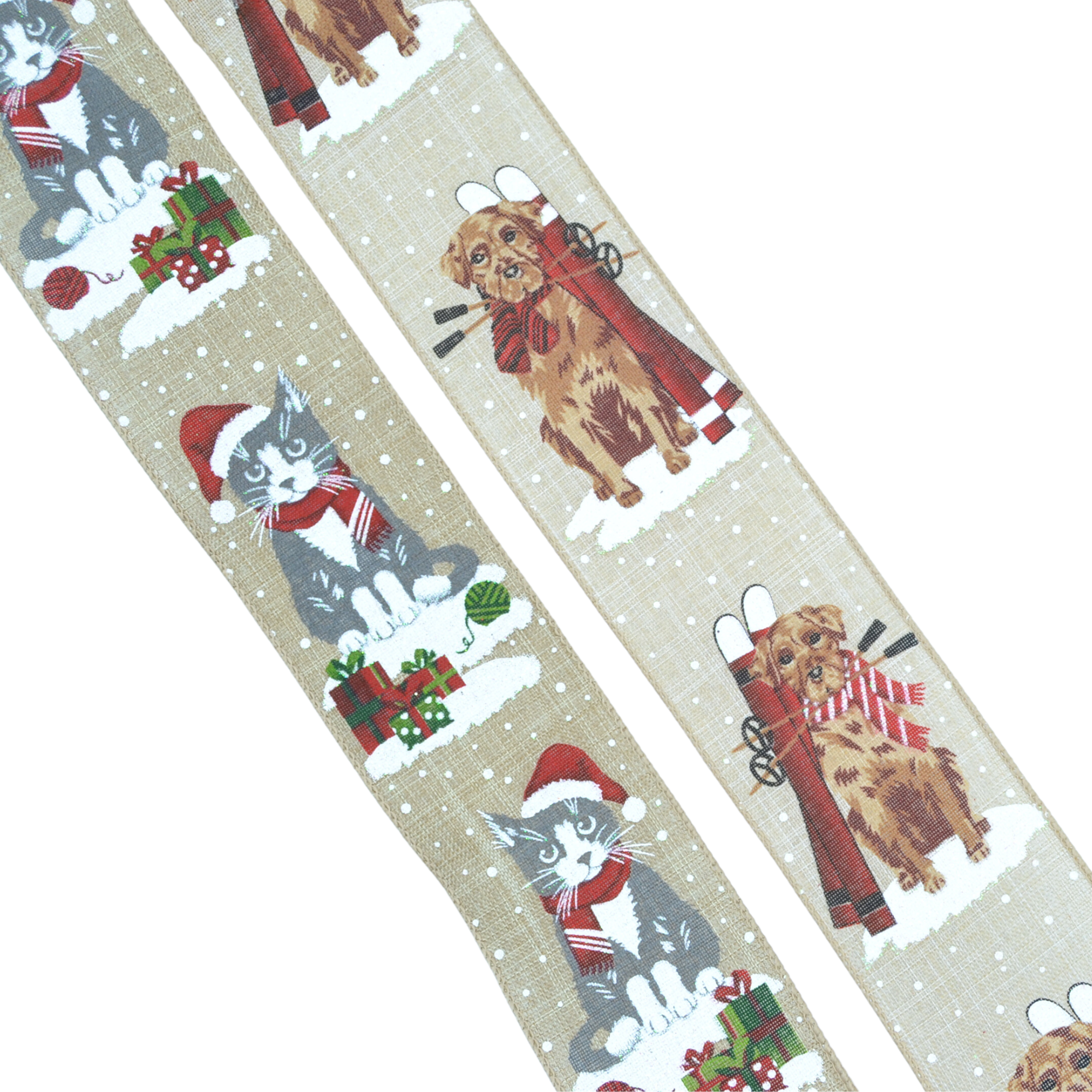 Wire Edged Ribbon in Snow Dog 63mm. Beautiful festive printed ribbons edged with wire making them very versatile for many crafts, Christmas decorations, gift wrapping, wreath making, creating bows and more.