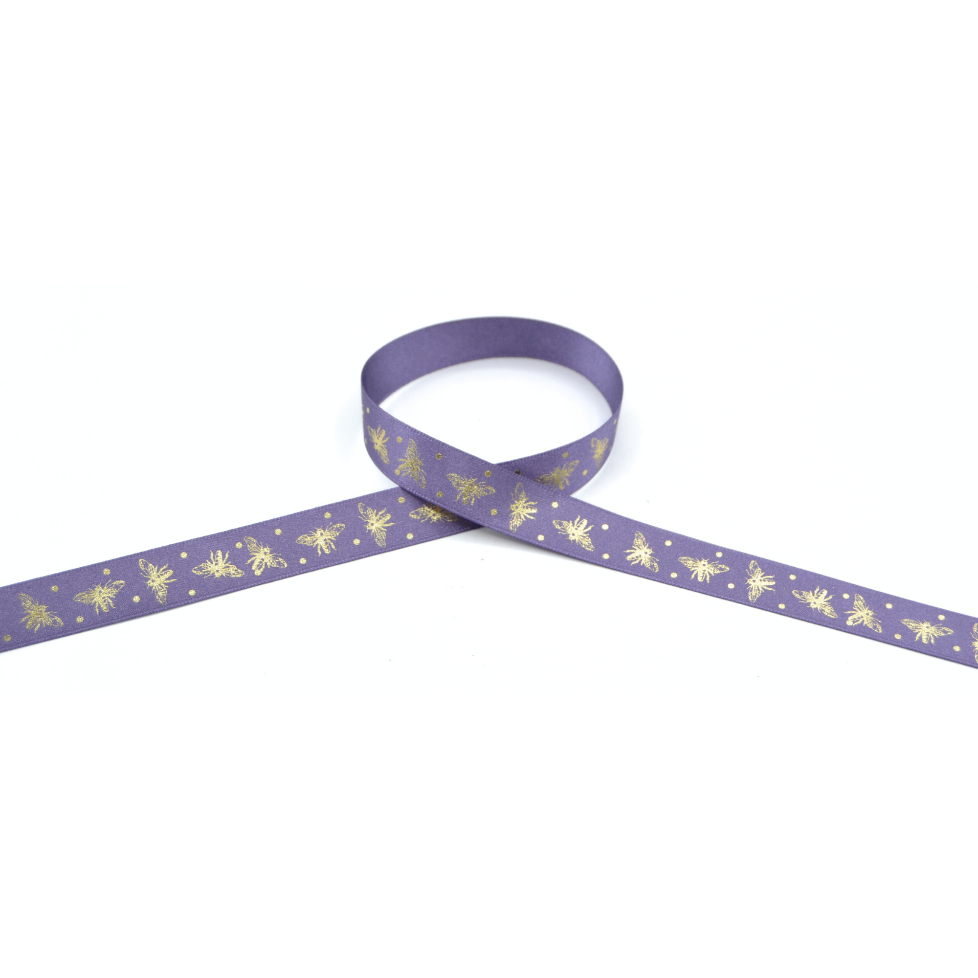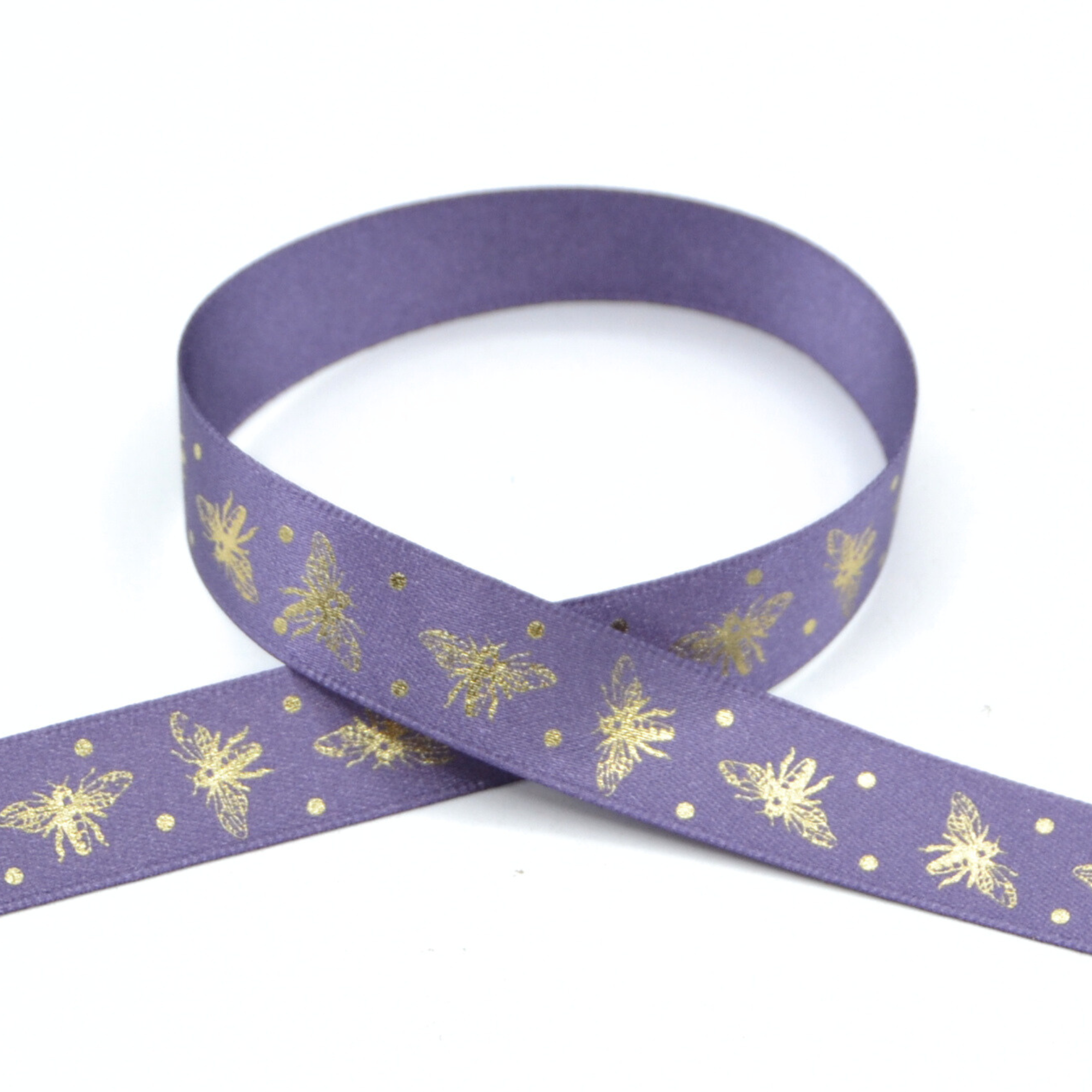 Sparkle Bee 15mm Double Sided Satin Ribbon in Mulberry/Gold. Gorgeous collection of ribbons with golden sparkly bees printed on double-sided satin. Dress events with homemade decorations, birthday gifting, wrap cakes and bouquets with trailing colourful trims, children’s crafts and much more.